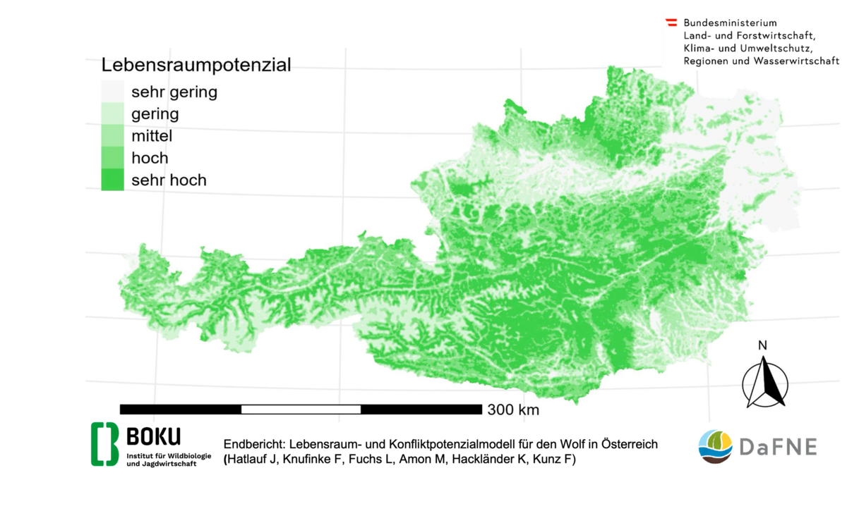 Im Auftrag des österreichischen Bundesministeriums für Land- und Forstwirtschaft, Klima- und Umweltschutz, Regionen und Wasserwirtschaft (BMLUK) hat die BOKU nun wissenschaftlich fundiert einige erste Teilaspekte erhoben und untersucht, wo der Wolf in Österreich rein ökologisch gesehen geeignete Lebensräume findet und wo diese Flächen gleichzeitig vom Menschen und von Nutztieren genutzt werden, sodass Konflikte entstehen können.