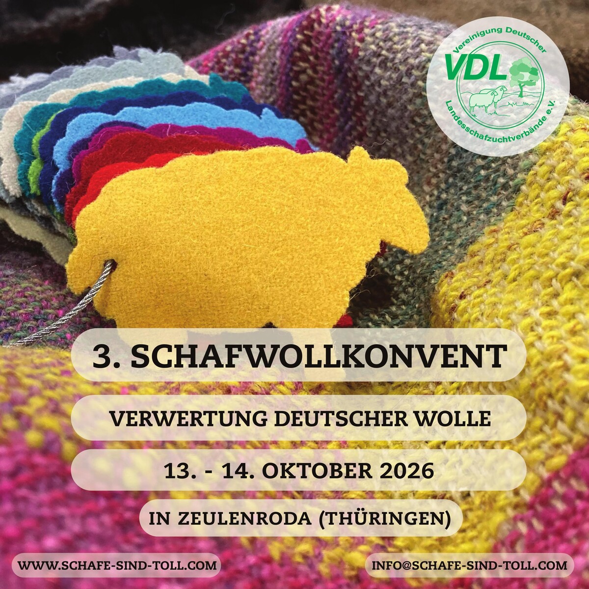 Auch in diesem Jahr lädt die Vereinigung Deutscher Landesschafzuchtverbände e.V. (VDL) zum zweitägigen Schafwollkonvent am 13. und 14. Oktober 2026 in Zeulenroda (Thüringen) ein.