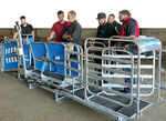 Nach dem Aufbau - Verbindung der Einzelelemente, Anbringen des Wiegecomputers, Anschluss des Kompressors, der Druckluftschläuche und des Ohrmarkenlesegerätes - führte Dirk Rösener den praktischen Einsatz des TePari-Behandlungsstandes HD3 vor.