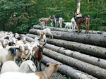 Kletterkünstler - Auf dem Weg durch den Wald zeigt sich der Unterschied zwischen Schaf und Ziege: Die Schafe bleiben brav unten auf dem Weg, zumindest die meisten. Den neugierigen Ziegen kommt so ein Stapel Baumstämme gerade recht, um sich die Welt von oben anzuschauen.