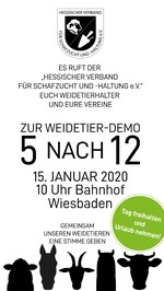 Angesichts der zunehmenden Wolfsproblematik in Hessen veröffentlichte der Hessische Verband für Schafzucht und - haltung e. V. die folgende Pressemitteilung und ein Forderungspapier für den Umgang mit dem Wolf. Zusammen mit Weidetierhalter möchte der Verband am 15. Januar 2020 vor den Landtag in Wiesbaden ziehen und von den Landespolitkern Antworten auf die gestellten Forderungen verlangen.