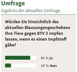 Daher möchten wir in unserer aktuellen Umfrage von Ihnen wissen, ob Sie Ihre Tiere gegen BTV 3 impfen lassen würden, wenn es einen angepassten Impfstoff gäbe.