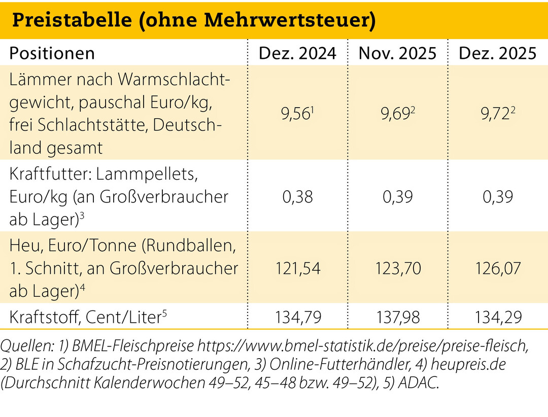 Im Dezember 2025 ist der Durchschnittspreis pro Kilo Lammfleisch Warmschlachtgewicht um 3 Cent gegenüber seinem Vormonat gestiegen. Dies zusammen mit einer Verbilligung des Diesels um 3,7 Cent hat das Dezember-Ergebnis im Vergleich zu dem vom November 2025 um 313 Euro verbessert – trotz eines leichten Kostenanstiegs beim Heu (Schafzucht 3/2026, Seite 29). Der Vorsprung von 2025 gegenüber 2024 läge nur noch bei 940 Euro, wenn die Dezemberpreise der beiden Jahre jeweils übers ganze Jahr gelten würden (Tabellen). Das Jahr 2025 Der Durchschnittspreis für Lammfleisch lag 2025 mit 9,91 Euro um 11,6 % höher als 2024. Allerdings beruht der hohe Wert hauptsächlich auf einem dreimonatigen Hoch mit Preisen um die 10,50 Euro zwischen April und Juni....