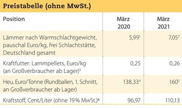 Frau Musterman freut sich: Im März hat der durchschnittliche Kilopreis für Lammfleisch endlich die 7-Euro-Grenze geknackt! In der Woche vor Ostern lag der Preis sogar bei 7,20 Euro/kg! Leider sind auch die monatlichen Durchschnittspreise für Kraftfutter und Diesel gegenüber dem Vormonat leicht...