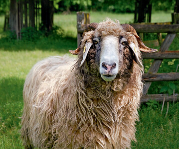 Der Steinschafwidder ist das Wappentier der Gemeinde Tux im österreichischem Zillertal. Diese traditionelle Schafrasse Tirols gibt es im weißen, silber- bis anthrazitgrauem Farbschlag.